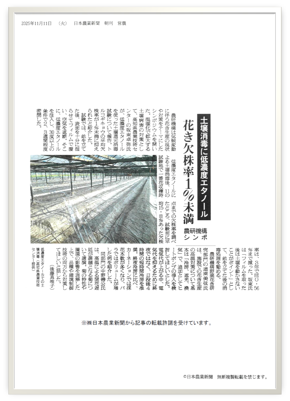 11/11(火)付日本農業新聞にて、低濃度エタノールによる土壌還元消毒によってトルコギキョウの欠株率が1%未満に抑えられたことが紹介されましたのでお知らせします。