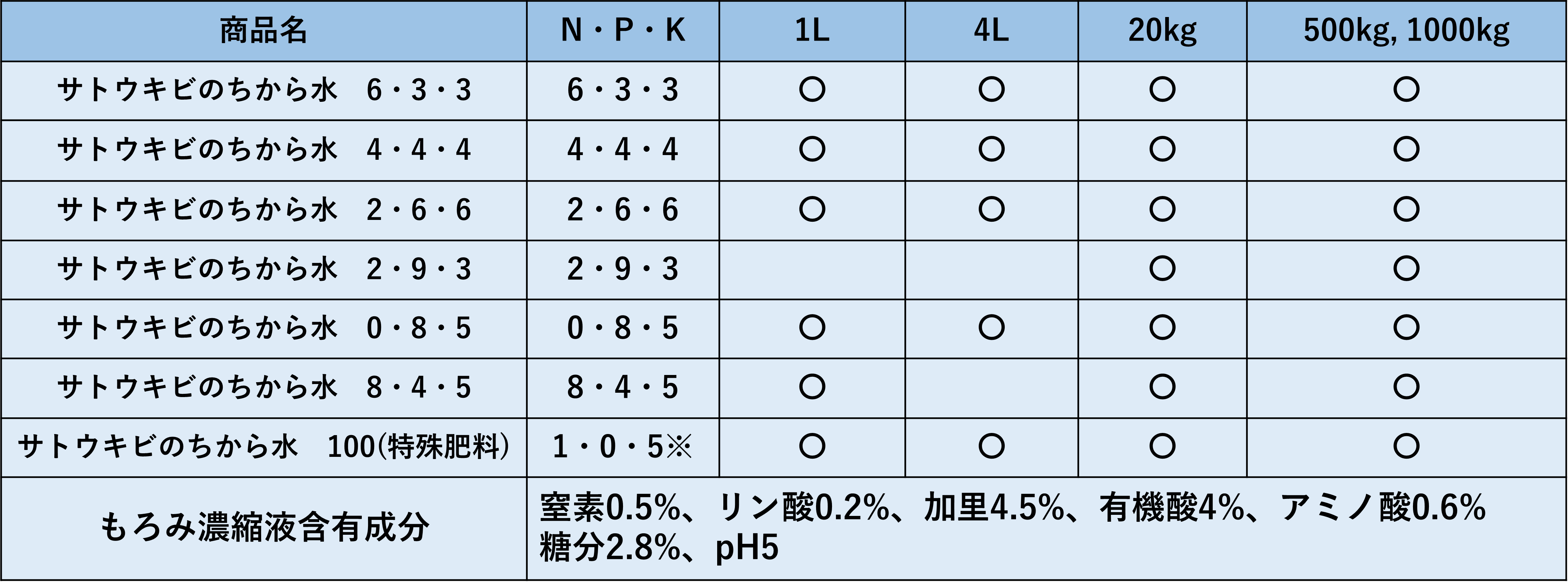 サトウキビのちから水6・3・3 サトウキビのちから水4・4・4 サトウキビのちから水2・6・6 サトウキビのちから水0・8・5 サトウキビのちから水100(特殊肥料) サトウキビのちから水8・4・5 サトウキビのちから水2・9・3 ・パンフレットはこちら ・事例集はこちら ・安全データシート(SDS)はこちら
